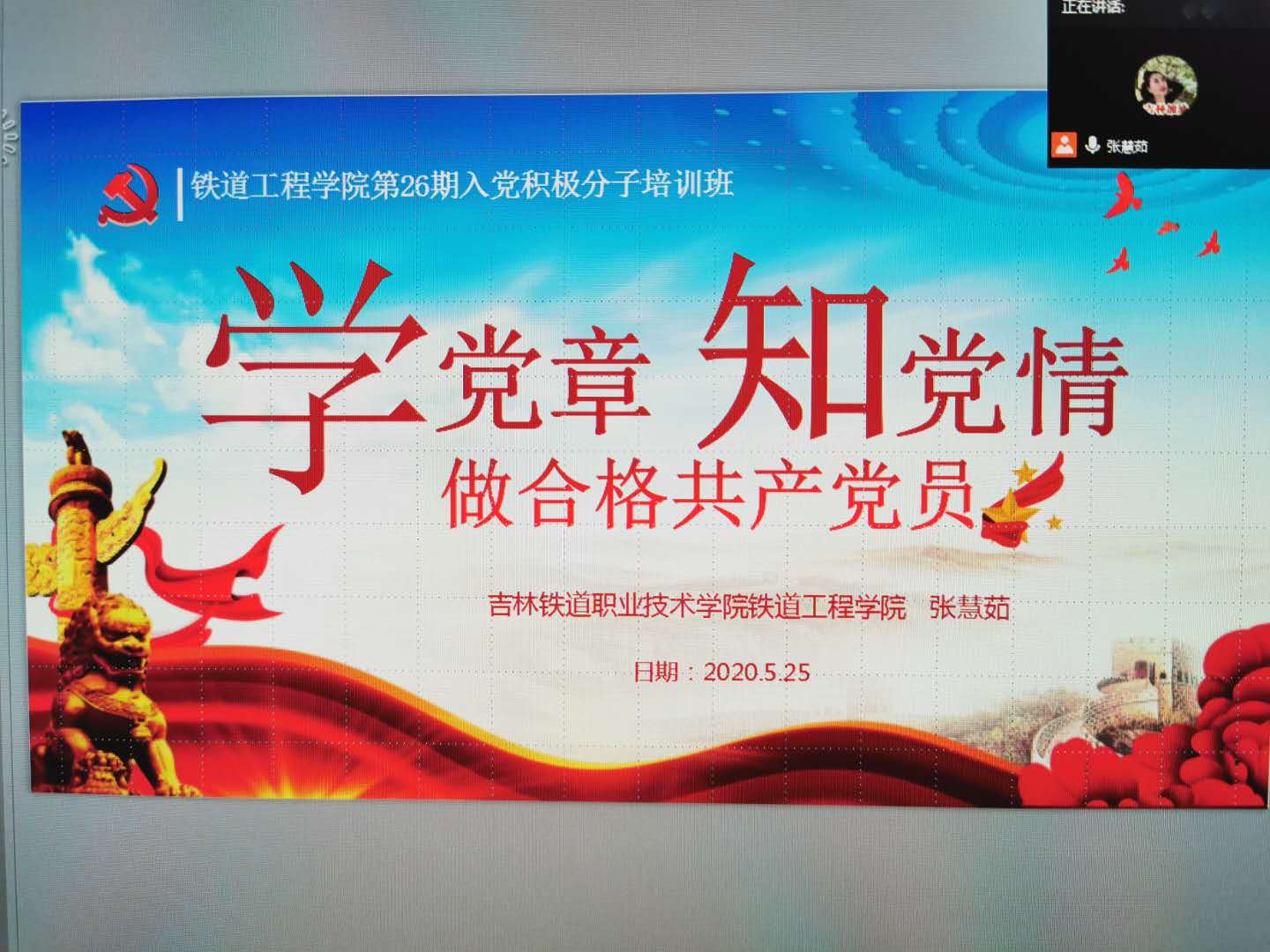 5月24日,铁道工程学院通过线上形式举行了第26期入党积极分子培训班开班仪式。学院党总支书记韩兵兵、党总支副书记张慧茹、学生党支部书记于鹏、全体辅导员及第26期入党积极分子培训班学员参加了本次开班仪式,仪式由张慧茹主持。