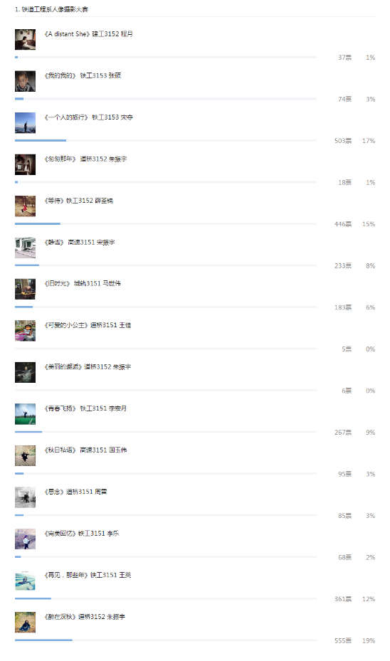最终15位选手的作品入围本次活动决赛。工作人员将15位选手作品上传至“铁道工程系”微信公众平台,并选拔出了本次比赛的最终结果。道桥3152班的朱振宇代表作《醉在深秋》获得本次活动一等奖、铁工3153班的宋夺代表作《一个人的旅行》获得二等奖、铁工3152班的薛荃锦代表作《等待》获得三等奖。光阴似箭,日月如梭,时光的匆匆流逝,我们无法阻止。唯一能做的就是把那份记忆用照片定格,使其成为永恒……