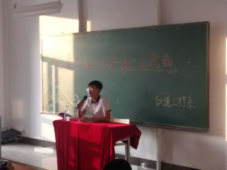 为树立正确的就业观,6月22日,我系邀请了2015届优秀毕业生、上任系学生会主席高速铁道技术3121班代印鑫同学在教学楼西202教室,就个人成长和就业经验做了汇报演讲,我系2013级学生踊跃参加。