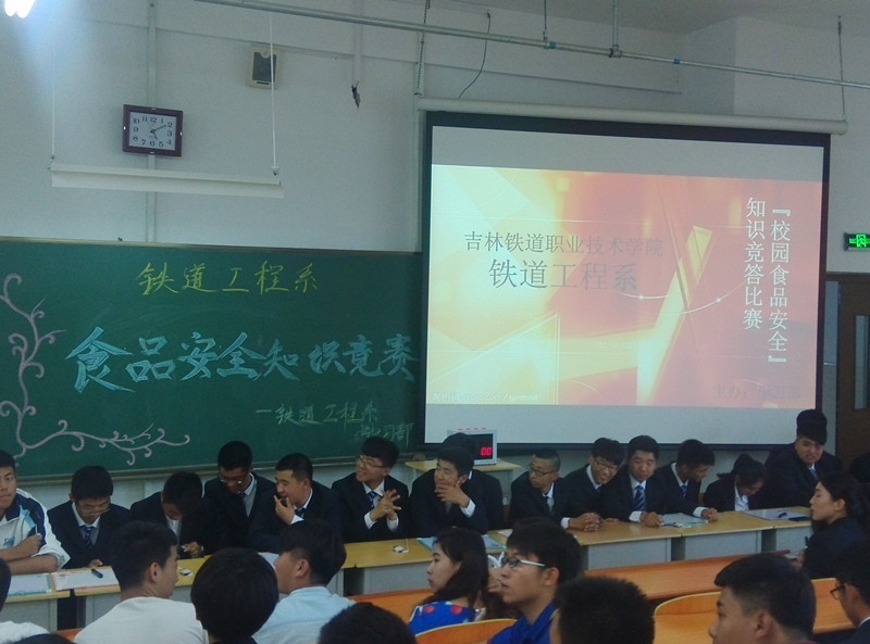 为了深入宣传贯彻《食品安全法》,普及食品安全知识,提高同学们对食品安全上的高度认识。根据《国务院关于加强食品安全工作的决定》和《国务院食品安全办等十八部门关于开展2015 年全国食品安全宣传周活动的通知》文件精神,落实关于认真做好食品安全宣传活动周的通知要求。铁道工程系于2015年6月17日下午在教学楼西201举办以“保障食品安全,共建和谐校园”为主题的食品安全知识竞赛活动。 本次竞赛活动分为10个参赛队伍,每队2人,题目类别分为必答题、抢答题和风险题三种题型,分别从食品安全法、正确的饮食观、食品安全理念还有日常食品安全常识四个方面进行作答。活动现场氛围十分热烈,选手们对题目掌握很好,抢答激烈。最后建筑工程技术3141班获得第一名、城市轨道交通技术3141班获得第二名、铁道工程技术3141班获得第三名。