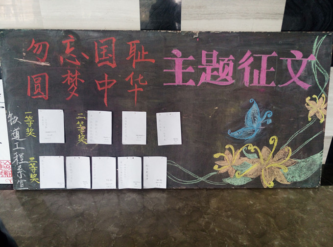 为纪念世界反法西斯胜利暨中国抗击日本侵略者胜利七十周年,铁道工程系团委于2015年4月17日举办“勿忘国耻,爱我中华”主题征文大赛,在本次大赛中,各班同学在各班团支书的指导下,利用团课时间学习反法西斯知识,并写下了以“勿忘国耻,爱我中华”为主题的征文。同学们表现积极,在他们的征文中,可以深深的感受到他们的爱国情怀。