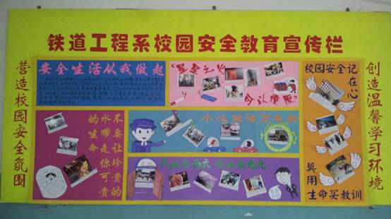 为贯彻落实学院安全稳定工作会议精神,提高大学生安全防范和避险能力,铁道工程系在开展“安全教育”主题班会的基础上,设计了生动的“校园安全教育宣传栏”展板,希望在紧张学习生活的间隙,能让大家感受到温馨、安全、和谐的校园氛围,将安全知识教育工作落实到每一名学生。