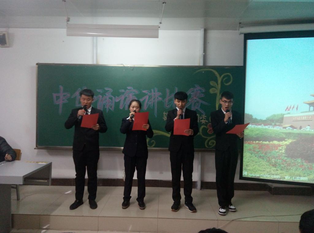 比赛中,参赛选手们身穿黑色西服,容光焕发,通过精心筹备,他们通过充满诗意的音乐和图文结合等创意形式歌颂着中华大地,用洪亮的声音朗读着对祖国的赞歌,声情并茂的讲述中华文化,中国历史,时代精神。经过一番激烈的角逐,最终,桥隧1601班的李小村拔得头筹,道桥1601班获得团体赛一等奖。