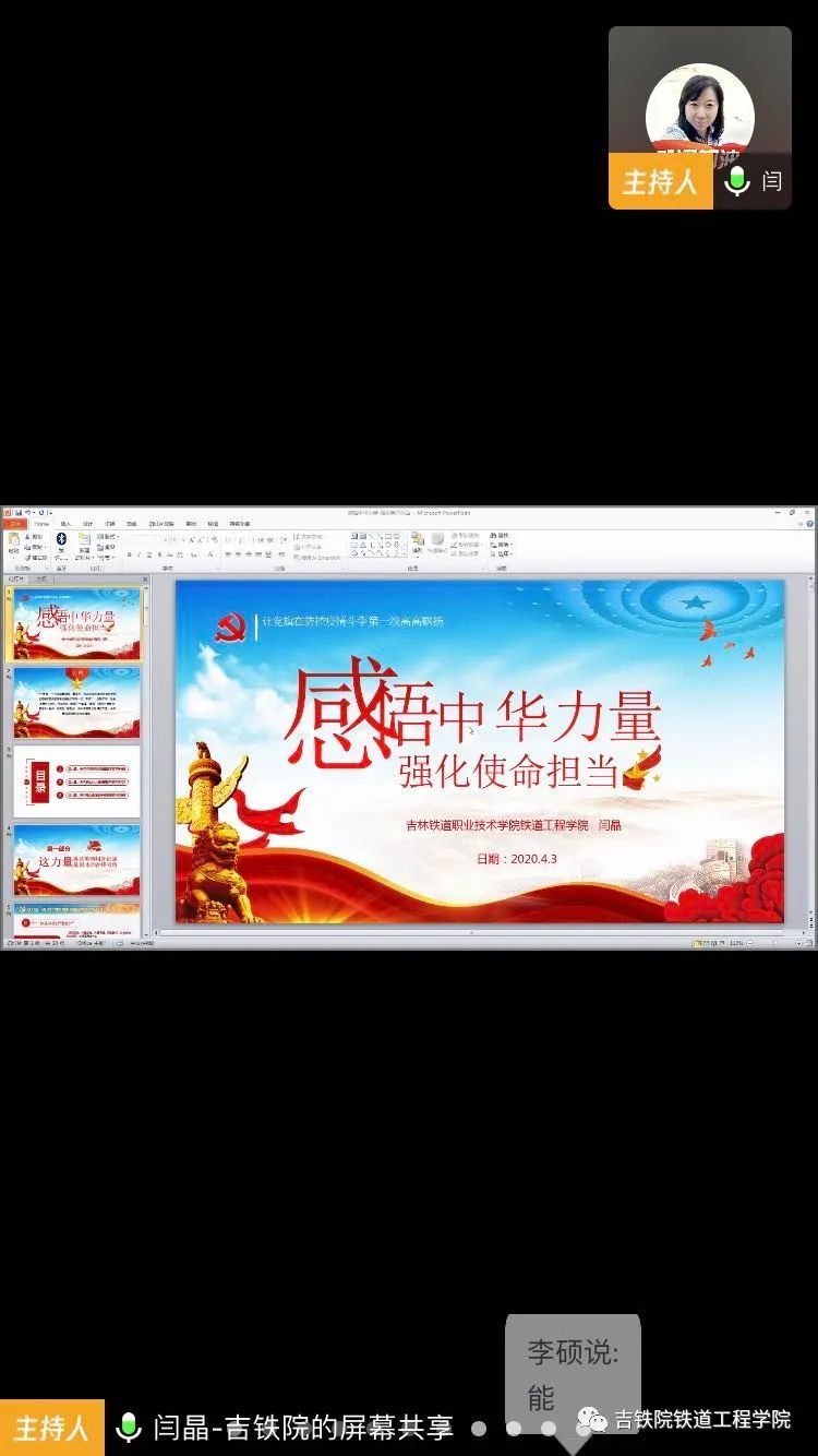 为深入贯彻习近平总书记关于抗击新冠肺炎疫情的各项指示,引导党员充分发挥先锋模范作用,强化“守初心、担使命”的基本要求,为打赢疫情防控阻击战鼓干劲聚力量。4月3日中午,铁道工程学院党总支通过腾讯视频App开展《感悟中华力量,强化使命担当》线上疫情防控专题党课,本次党课的主讲人是院办主任闫晶,学院全体党员共同参加。