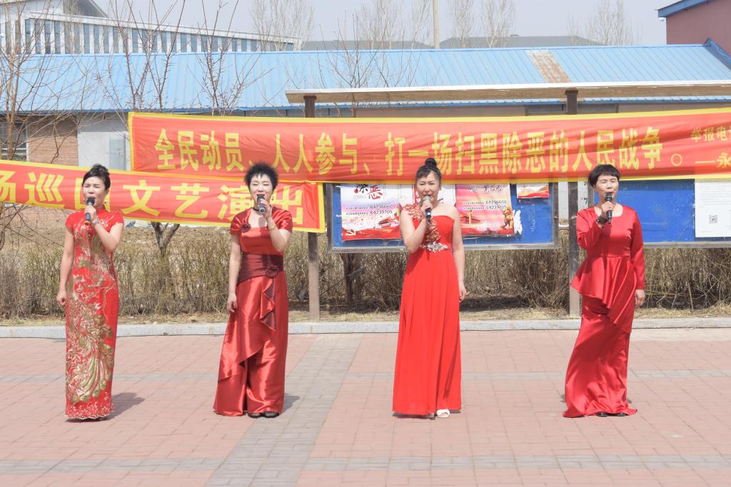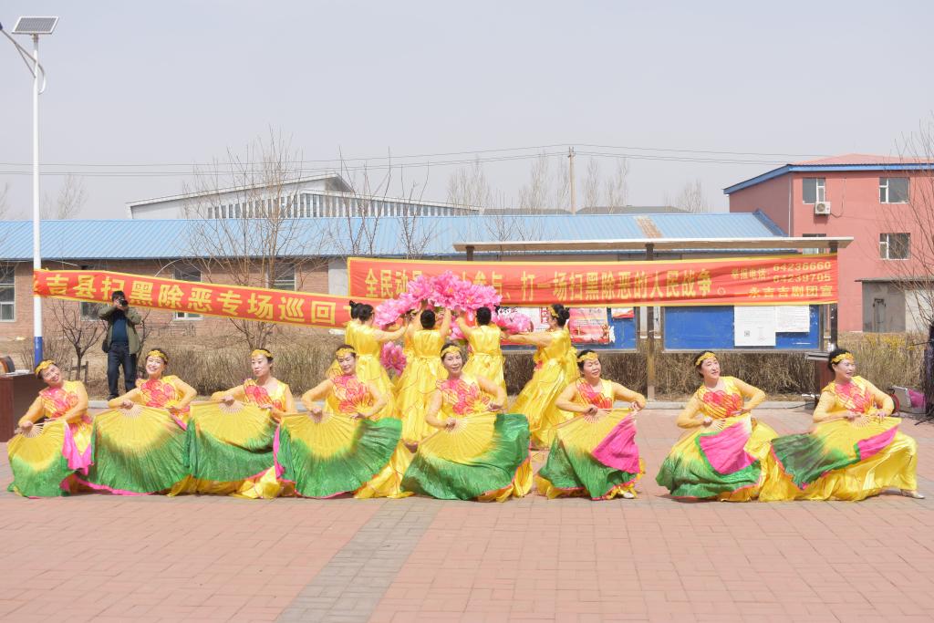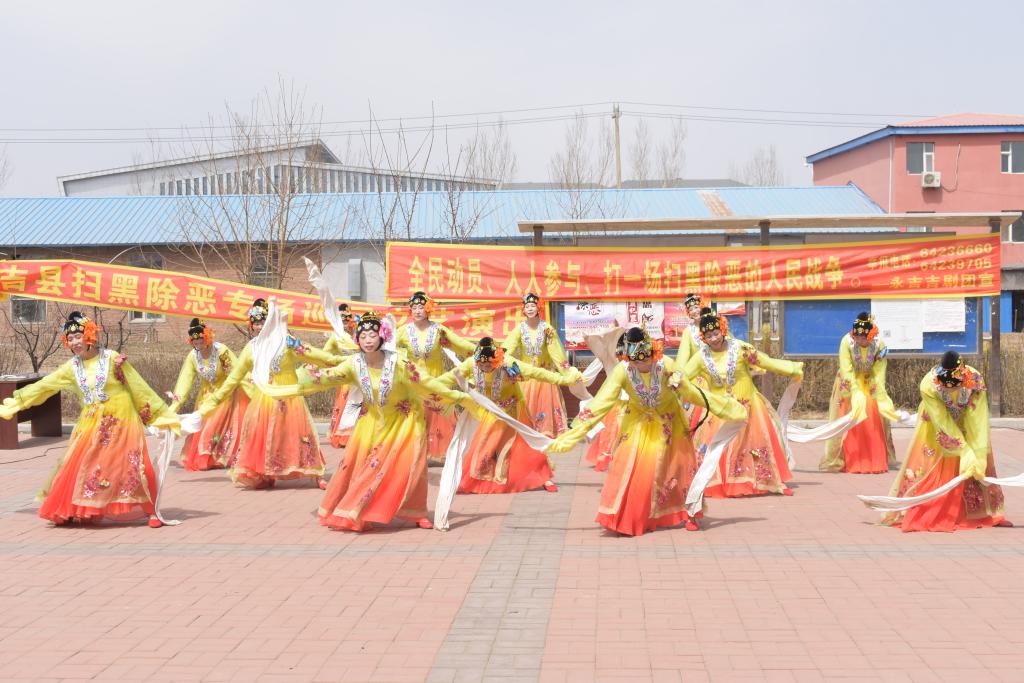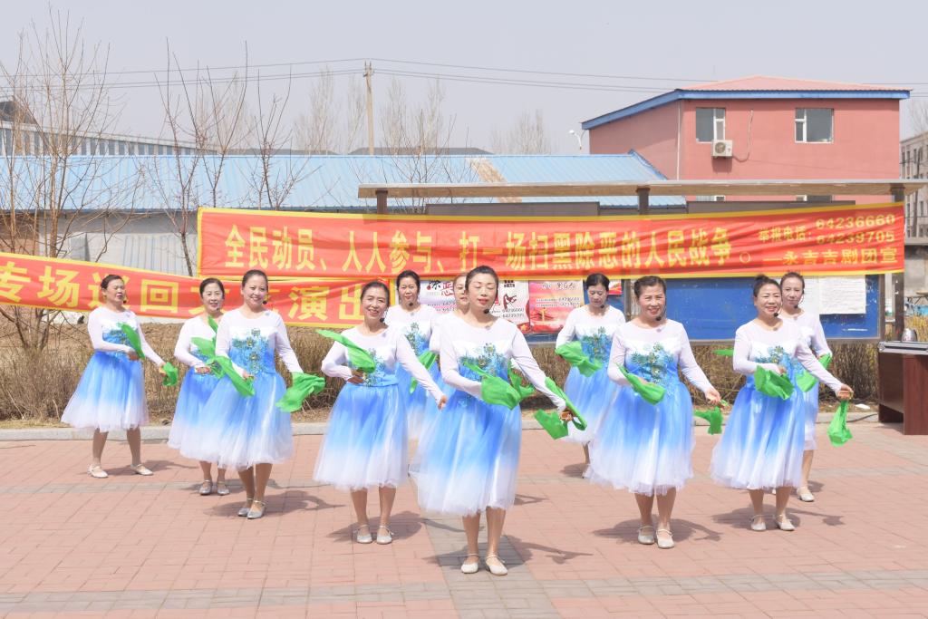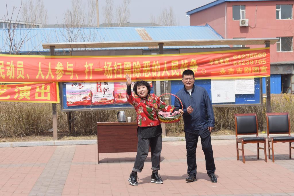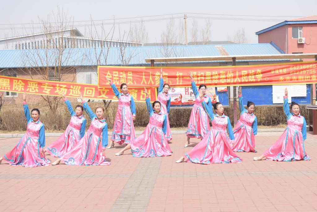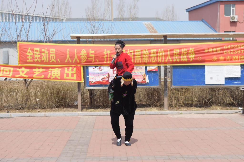 永吉县文化馆尚美艺术团表演的快伴舞《扫黑除恶民心快》,道出了老百姓对扫黑除恶、净化环境、共建平安的快乐心声;县吉剧团演唱的二人转《包公断后》以铁面无私的包公暗喻扫黑除恶的雷霆之力;《逗你乐翻天》唱出了和谐永吉、百姓快乐幸福之感;合唱《咱老百姓》唱出了老百姓对党的热爱和对美好新时代的赞颂,结束舞蹈《中华全家福》表现了中华大家庭和谐共处,民族腾飞的盛世华章。一个多小时的演出高潮迭起,以寓教于乐的手段,让观众了解了党和政府扫黑除恶的决心和打击黑恶的重点要点知识,起到了宣传推动“扫黑除恶专项斗争”的重要作用。