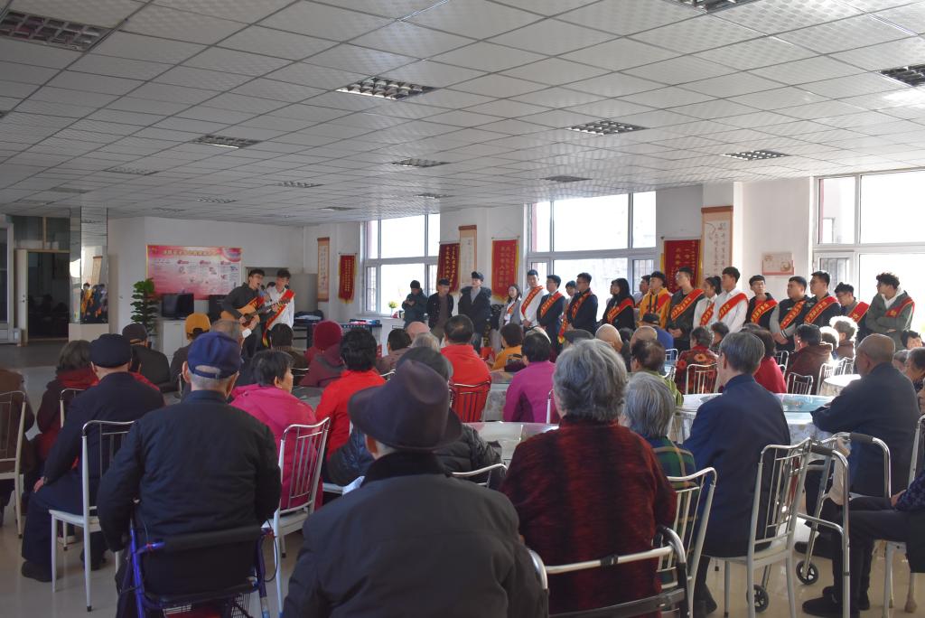 室外天寒地冻,室内温情浓浓。大家分工合作,扫地、擦玻璃、将庭院内外打扫的整洁明亮,各类物品摆放井然有序;文艺演出同学们精神抖擞,一个个精彩的节目引爆全场。合唱《当那一天来临》、《喀秋莎》、《国家》,歌曲独奏《突然好想你》、《再回首》以及小品《年轻的老人》等,引来阵阵掌声,温馨的小屋内到处是欢声笑语,老人们的脸上洋溢着幸福的微笑。志愿者们和老人坐在一起,看节目,话家常,共同度过了一段美好的时光。