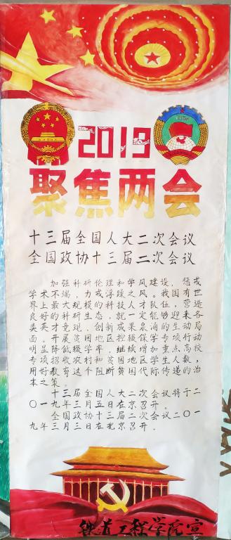 为了宣传两会精神,铁道工程学院宣传部集宣传部全体成员设计建议历时两天绘制完成。展板中,全国人民代表大会的会标和中国人民政治协商会议的会标,是两会的象征,表明了两会在全国乃至社会上的重要性;展板的标题“聚焦两会”四个字,采用了红黄渐变,红色体现我国吉寿喜庆的民族色彩传统,黄色体现华贵富丽,黄、红相间,互为衬托,更增加了图案的瑰丽色彩;展板下方的天安门则是中国的象征,代表着中国正在逐渐强大,走向世界舞台的中央;而图中的文字则表明了两会的主要内容。