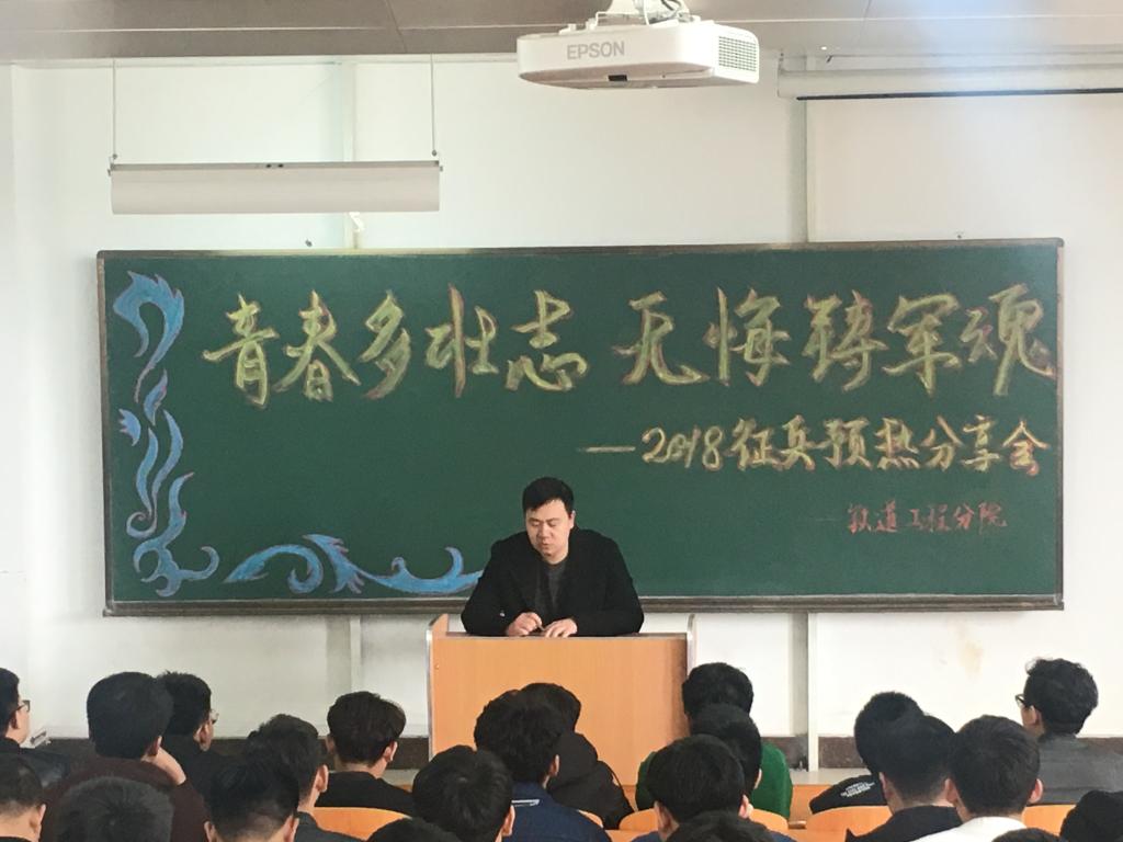 又到一年征兵季,优秀青年齐聚集,志在四方好男儿,心有梦想参军去。大学生应征入伍是提高兵源质量,促进国防现代化,推动军队科学发展,提高大学生全面素质的战略使命。为切实做好2018年学院征兵工作,铁道工程分院邀请现任中国人民解放军海军北海舰队旅顺基地参谋部警卫侦察连警卫纠察班班长王泽丞上等兵于4月7日在阶梯西201教室作题为“青春多壮志,无悔铸军魂”征兵预热动员会,分院全体在校男同学参加会议。会议由分院学办主任于鹏主持。