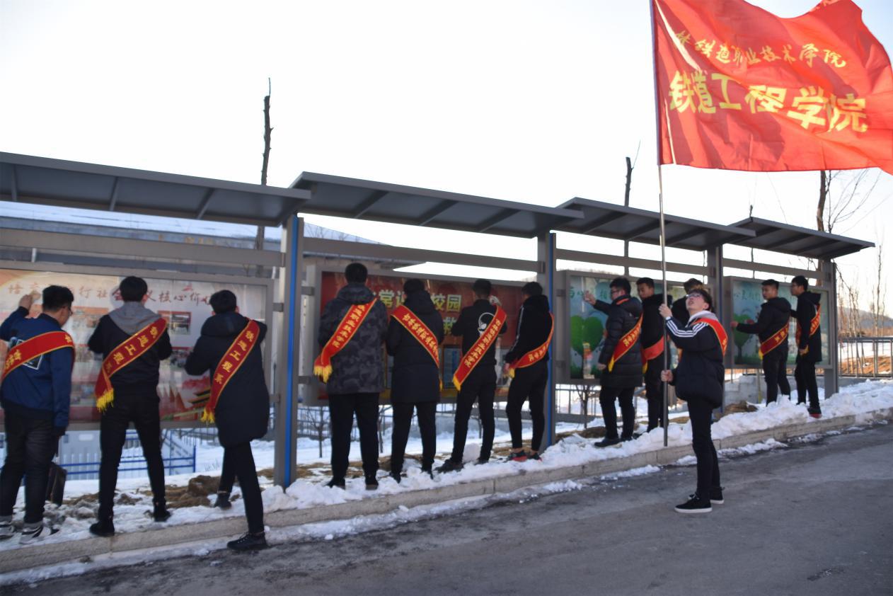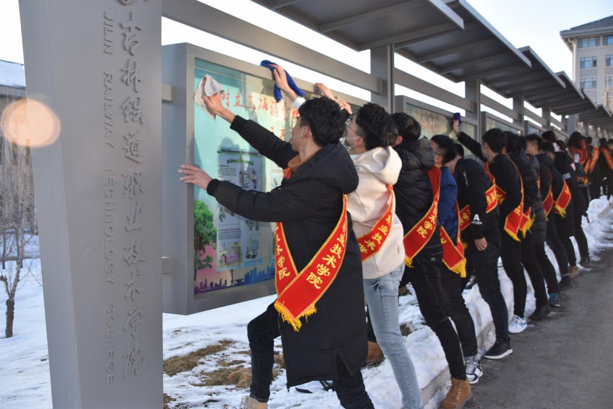 校园主干道的展示板处,同学们热火朝天地进行着清洁工作,虽然活动开展的时间段有些寒冷,但这并不能浇灭同学们为清洁校园而产生的热情之火。由于之前天气状况不好,雨雪大风天气,展示板的玻璃上污渍横生较难清理。我分院学生干部不怕辛苦认真地带队清理着每一个藏有污渍的角落。最终,在他们不懈的努力下,一块块告示展牌洁净如新。