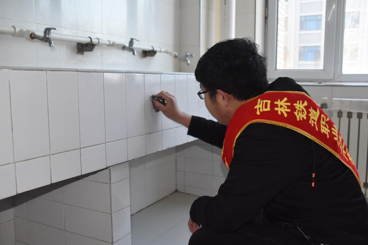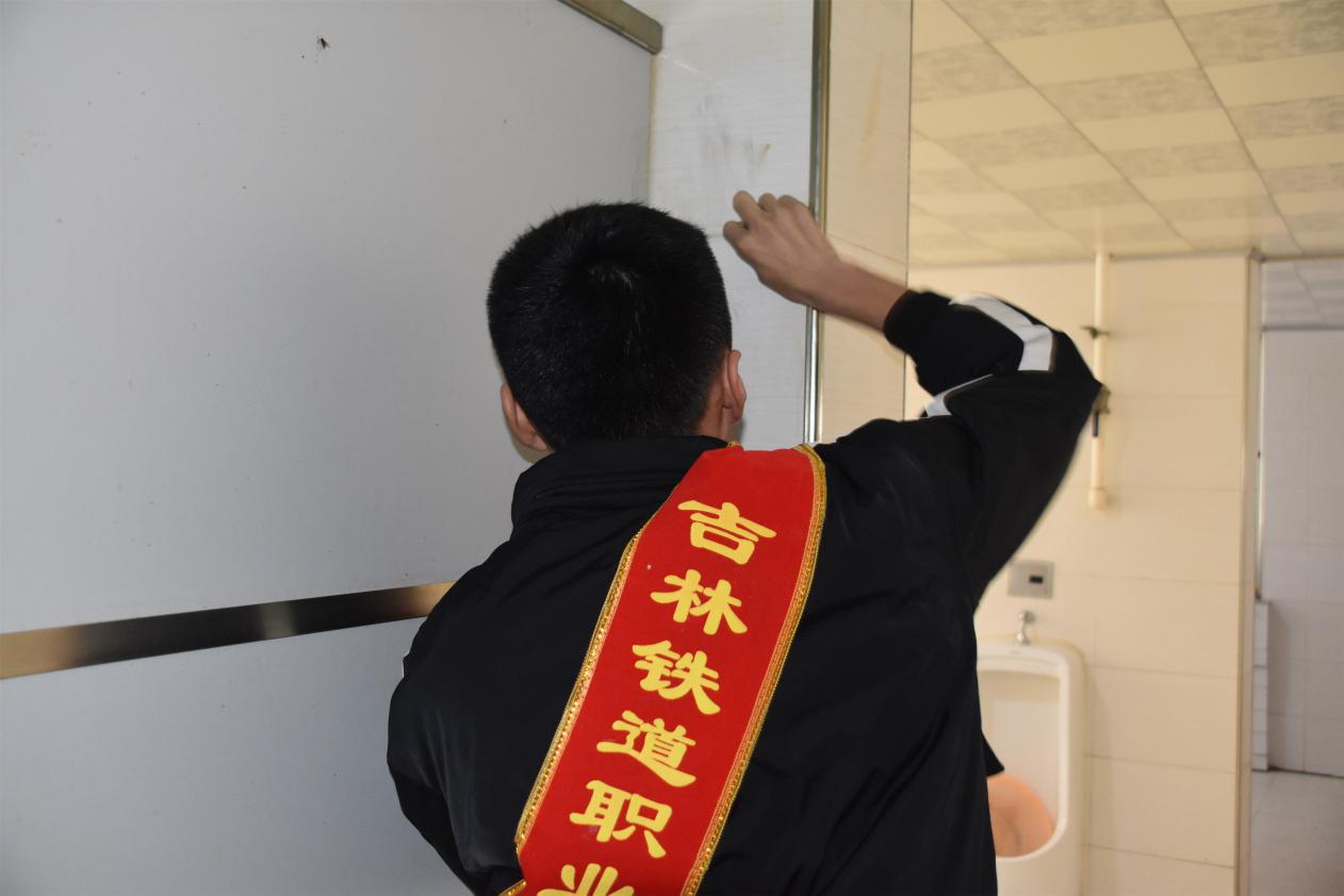 在这同一时间,铁道工程分院的另一小组各公寓卫生间里清理着门板、墙壁上隐藏着的小广告。由于粘贴时间较长,它们已牢牢的与墙面粘在一起,尽管清理起来甚是麻烦,但大家秉持着绝不放弃任何一处“狗皮膏药”的原则,通过不断的努力,最终彻底地将墙面清理干净,使整个墙面焕然一新。