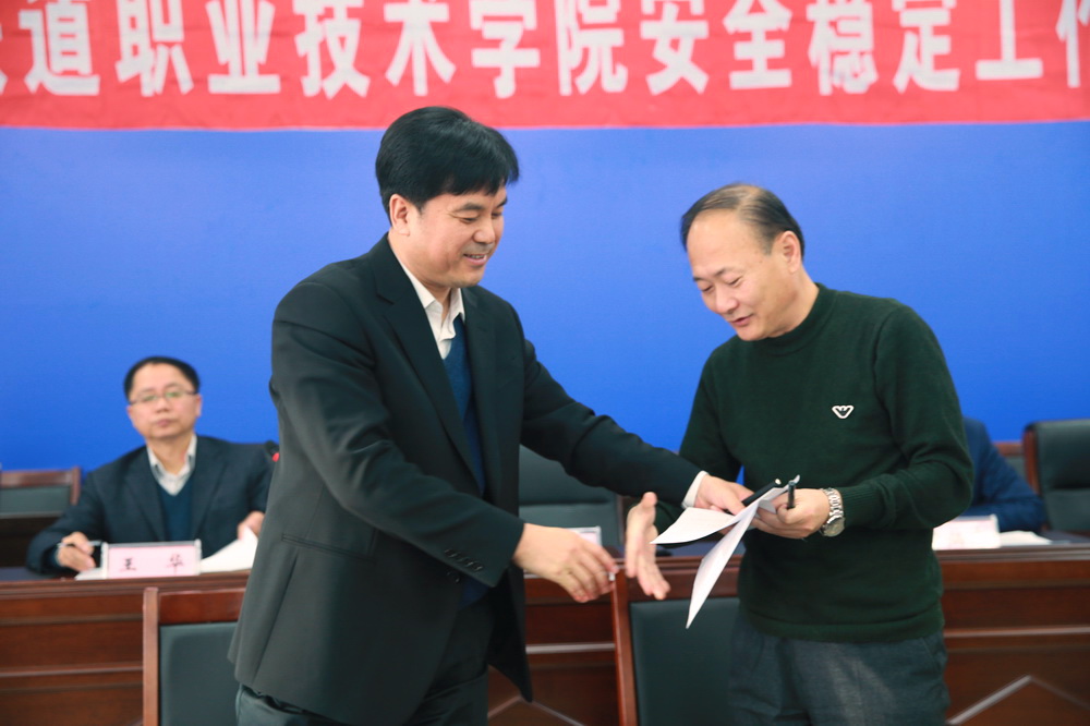 会上,首先由徐彤宝副书记作2016年学院安全稳定工作报告,认真总结了我院2016年安全稳定工作,安排部署2017年安全稳定工作。他指出,一年来学院安全稳定工作在学院党委的正确领导下,紧紧围绕学院的中心工作,以建设平安和谐校园为目标,牢固树立“安全第一、预防为主”的思想,认真贯彻落实上级有关部门安全稳定工作的重要部署和指示精神, 逐步夯实校园安全稳定工作基础,净化校园周边环境,不断促进学院的平安和谐建设,安全稳定工作取得了实质性的成果,全年实现了安全稳定工作 “六无” 的工作目标,为学院持续、稳定、健康发展提供了强有力的安全保障。他强调,安全工作是一项长期的系统性工程,不能有丝毫松懈和半点马虎。2017年学院要以党的十八大、十八届四中、五中、六中全会精神统领全局,坚持“安全第一、预防为主”的方针,坚持“谁主管谁负责、谁使用谁负责”的原则,继续深入开展安全年活动,强化责任落实、加大整治力度,确保校园持续平安、和谐、稳定,确保实现无重伤以上人身伤亡责任事故、无火灾爆炸责任事故、无重大设备责任事故、无较大刑事案件、无重大治安案件、无群体性突发事件的工作目标。他希望,全院上下要从全局和战略的高度,进一步增强安全稳定工作的责任感和使命感,不断加大校园安全工作力度,严格落实各项安全防范措施,全面提高维护校园安全工作的能力,确保广大师生的生命、财产安全,为学院建设发展提供强有力的安全保障。