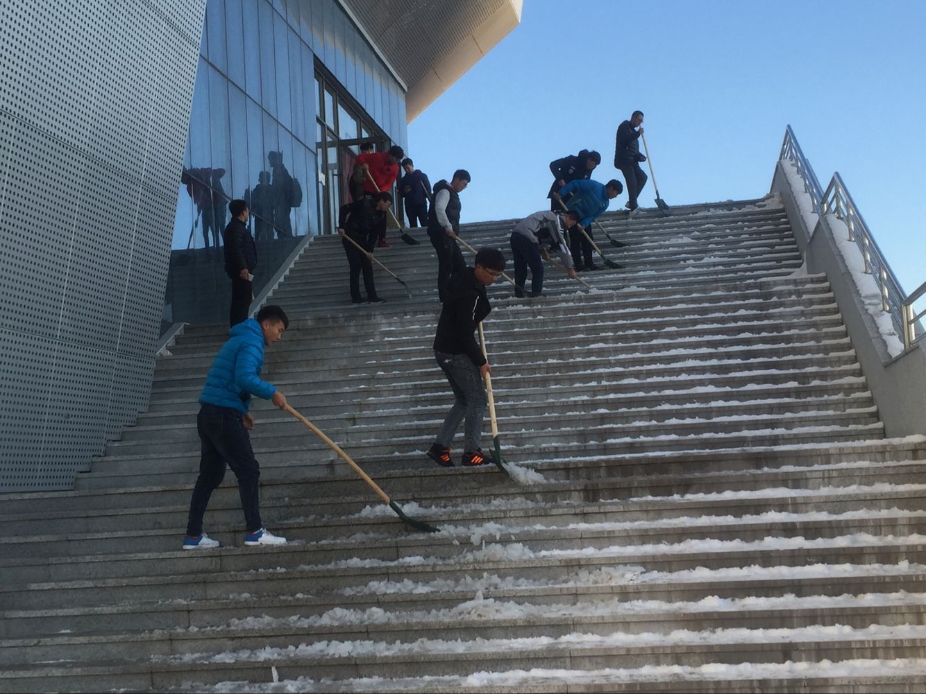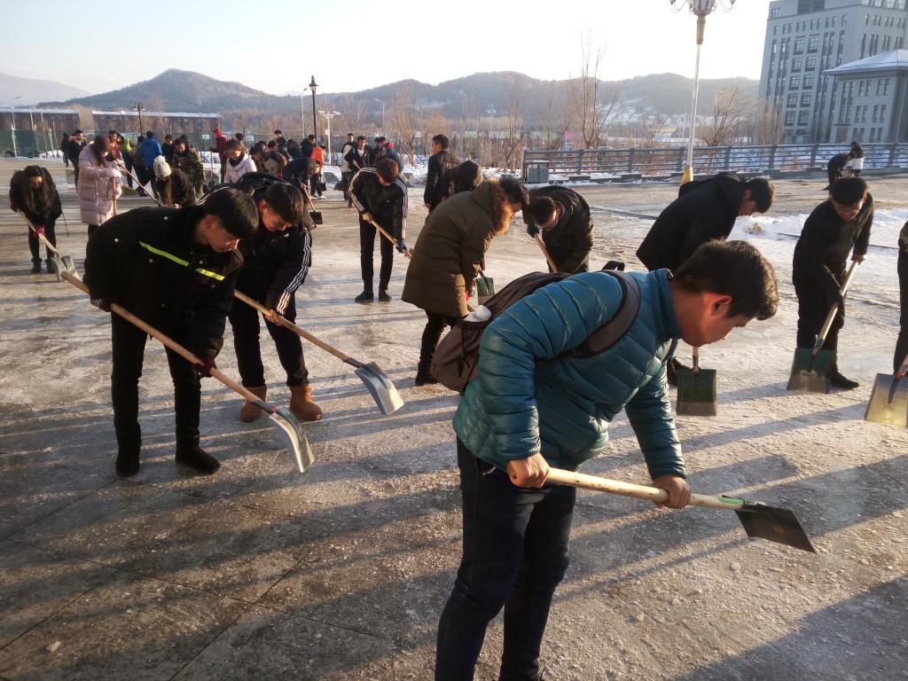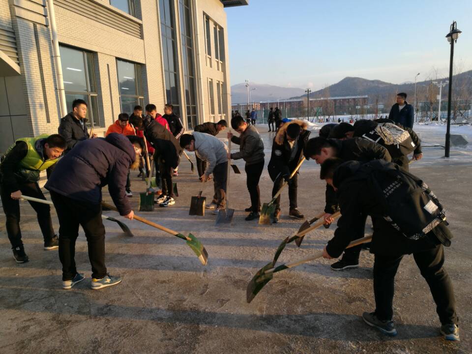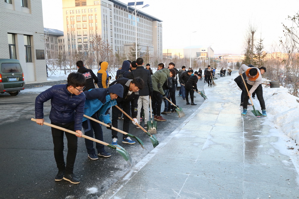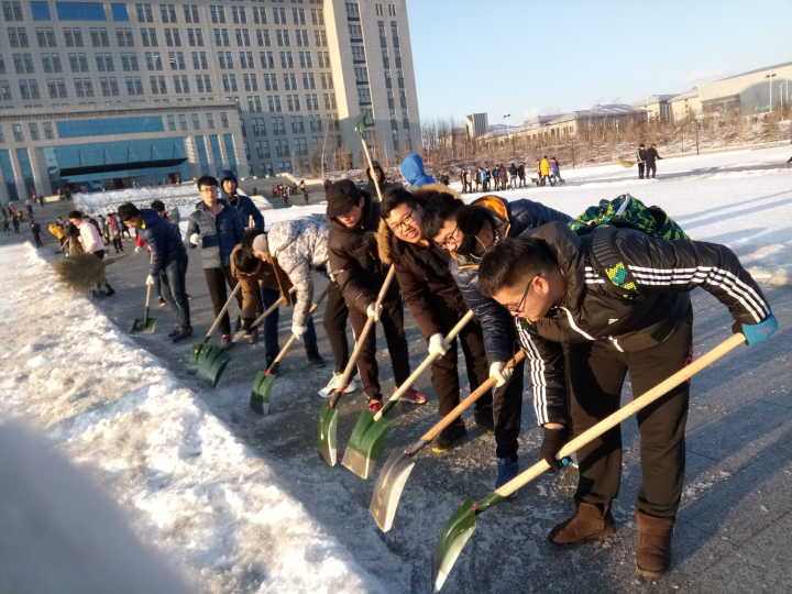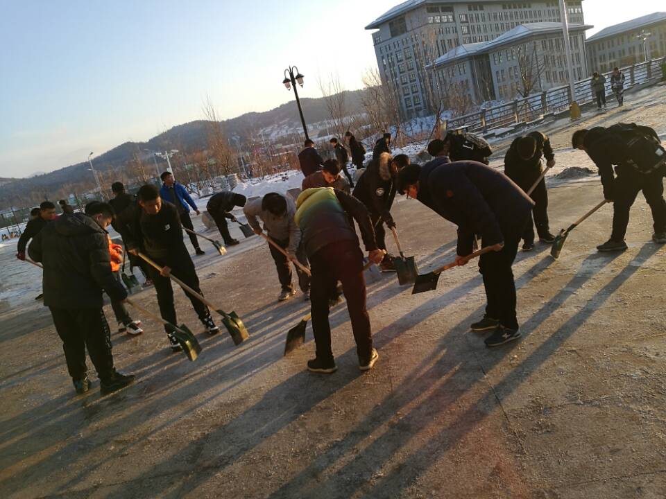 11月23日下午,在学生处、各系党总支的组织下,全院2000多名学生志愿者下课后对校园路面进行了清理。尽管路面的冰层很难清理,但学生们毫无怨言,顶着凌冽的寒风,用铁锹、铲子一点一点的清冰除雪,在大家的共同努力下,校园路面沉积的冰层被清理掉了。