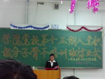 接着,优秀学员代表铁道工程系学生会秘书长邢岩同学代表全体学员进行了发言,她首先感谢这次院系领导老师提供了这次宝贵的学习机会,对珍贵的党校学习经历进行了总结,并代表大家表达了作为入党积极分子对加入中国共产党的渴望;最后,她表示将在今后的生活中以一名党员的标准要求自己,争取早日加入党组织。