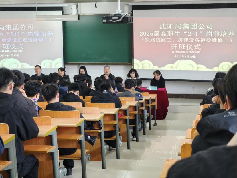 2025年4月10日,铁道工程学院于教学楼西301教室举行沈阳局集团公司2025届高职生“2+1”岗前培养(铁路线路工、房建设备巡检维修工)开班仪式。铁道工程学院院长徐光华,党总支副书记韩阳,副院长李东侠、副院长闫晶、学办主任张营、建筑工程教研室主任王永利及全体学员参加开班仪式,会议由徐光华主持。