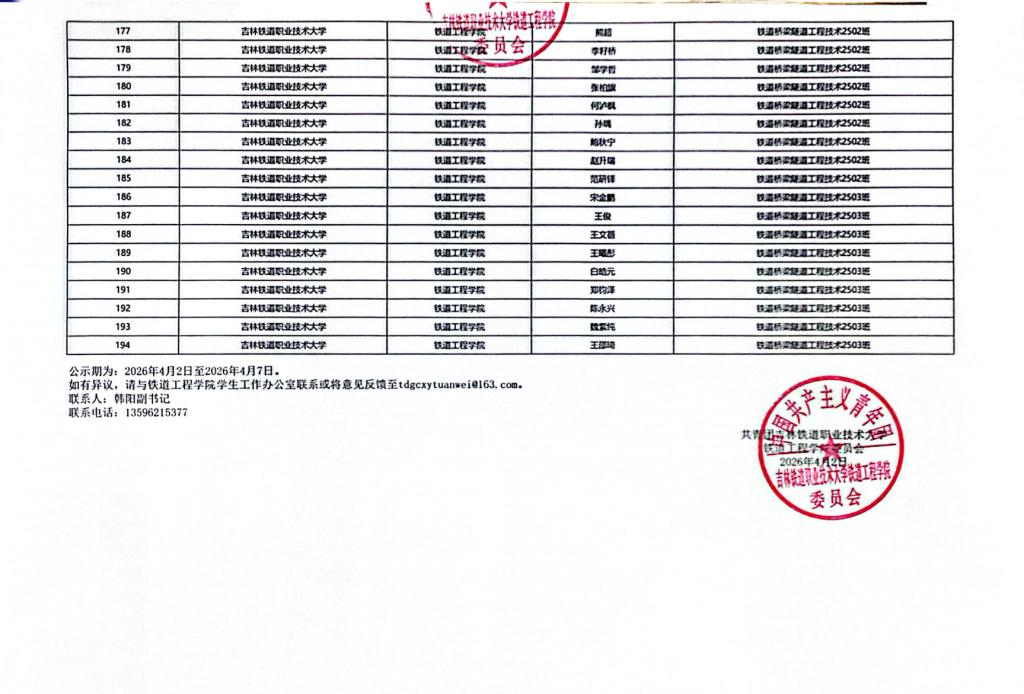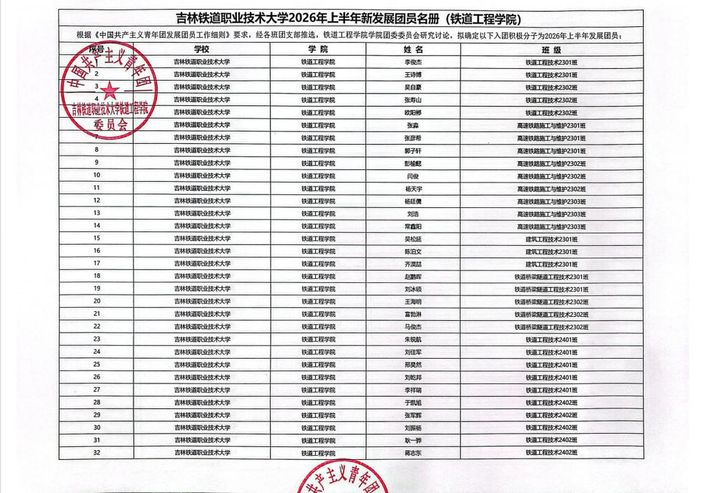 根据《中国共产主义青年团发展团员工作细则》要求,经过入团积极分子的培养教育和考察、具备团员条件的群众,依据团员先进性评价指导标准,经团支部、学院团委推荐,听取班主任、辅导员意见,并征求学院党总支领导意见,拟确定以下194名同学为2026年上半年发展团员,特在全院师生范围内进行公示。